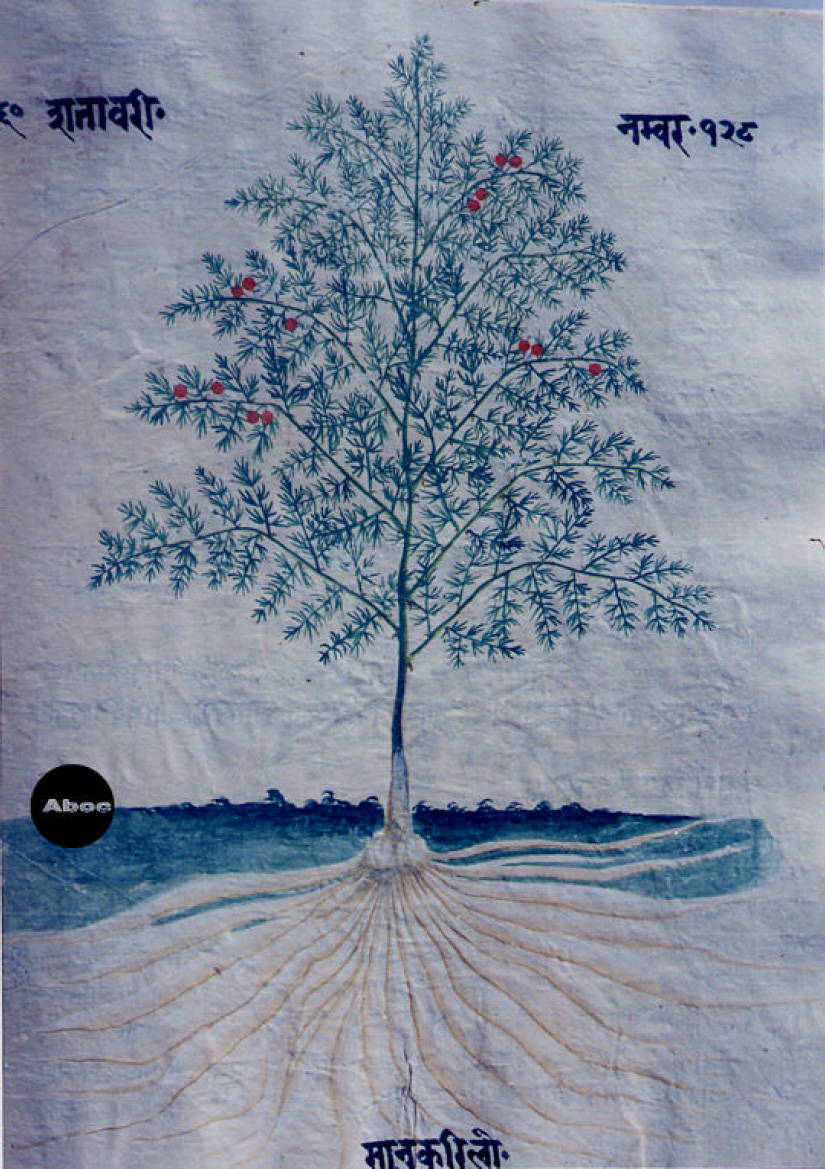 本書は手書きのアーユル・ヴェーダ本草図譜で、10巻より成る。そのうち8巻は植物篇で約800種類を扱い、1巻は動物篇で約100種類、1巻は鉱物篇で約70種類が扱われている。植物篇は1頁に1種類の植物が、葉はもちろん、花と実と根が必ず描かれ、生育場所を示す背景も描き込まれている。すべて着色図である。樹木が多いがその他の有用植物、とくに野菜や穀類は描写が精細で、たくさんの品種が紹介されている。イネは18種類、サトウキビは13種類も描かれている。ただし、区別がよくわからないものもある。裏面にはその植物に関する古典の記事がサンスクリット文とネパール文で記され、多くの言語によるその植物名が列記されている。アーユル・ヴェーダはインドに伝わる伝統医学の体系で、体全体の調和を保って健康に長寿を保つことに基本が置かれる。記事を読んでみると、それぞれの植物の効能や適用症もさることながら、西洋医学とは異なった考え方があることがわかり、興味深い。もっとも、図と記事が対応しているかどうかは検討を要する。