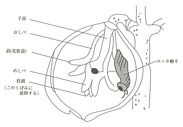 この蛾(♀)が受粉で果たす役割はきわめて典型的なので図を参考にして再度解説してみよう。まずユッカ蛾はおしべのねばねばの花粉を吸吻(吸い口)で玉状に丸めて、めしべの柱頭になすりつける。その後に産卵管を柱頭にさしこんで産卵し、さらにはじめに付けた花粉の玉をアゴの管で中に押しこむ。花粉といっしょに子房に入った卵は孵化して幼虫となり、未熟な種子を食べて成長し、果実の壁に穴をあけて脱出する。食べ残された種子が発芽して時代に引き継ぐわけだ。もし、この蛾がいなかったら、自分の力だけではユッカは絶滅の運命をたどるといっていい。