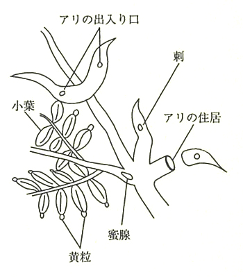 最後に、メキシコ産のマメ科の木、アリアカシアを紹介しよう。アリと仲よく生きている有名な木だ。この木の葉柄にある蜜腺が甘い蜜をアリたちに提供しているほかに、小葉の先に黄粒を付けタンパク質と脂肪に富んだごちそうまで用意している。さらに、ふくらんだ刺の中は空洞で、アリたちの住居にさしだしているから驚く。非常時には即戦即応でアリアカシアの生命を守ってくれる。