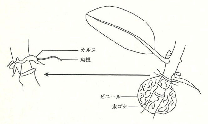師管をイメージづける身近な例をあげてみよう。5月は取り木のシーズンである。ゴムノキ、ドラセナ、シャクナゲ、カルミア、フジなど、観葉植物や、花木などたくさんある。取り木は主として、挿し木ができにくいものに対して行う一種の繁殖方法である。この原理が、やはり葉でつくられた養分を蓄積させて適当な湿り気を与えることにより、切り口から根を出させることなのである。方法は環状剥皮と全く同じで、施術後に水を適当に含ませた水ゴケ(大人の握りこぶし大)を傷口に巻いておくだけである。葉からの発根ホルモンが集中して根の原基ができると、茎の途中に根がモジャモジャとでてくるというわけだ。仕掛けて1ヵ月後に、傷口にカルス(癒傷組織)ができれば成功で、やがて発根が始まる。秋には一個の新しい個体が誕生することになる。