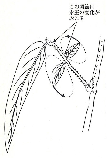踊りの原因は温度、湿度条件による細胞の液圧の変化。葉の付け根の関節部分で起こるためだ。