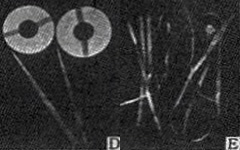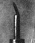 まずラミネート紙であるが、これは市販品があることを知った。きわめて薄い和紙又は化繊紙の片面にポリエチレンをラミネートしたもので、南国パルプ工業の製品はヒートロンとよばれ、東京加工紙製のものはラミコートという。この種の紙は最中などの和菓子の包紙によく用いられているので、少量ならこれを利用できる。紙質はヒートロンではPCS 30g/㎡が適当だった。この紙は何枚も重ねると互に滑ってしまって切り難い欠点があり、後述のような商品としてテープを製作する場合には幅7mmより細くは切れない。テープを手製するならば4mmと8mmの2種類を用意するとよい(図D、E)。次にハンダ鎮であるが60-80Wのラジオ用がよい。先の太いものは先端を約30°に斜に削り、面を長方形にヤスリで仕上げる(図C)。先が細い鎮は先端をたたきつぶしてから角度をつけて曲げる。先端は約90°の角度をつけて左右を削っておく(図B)。使い心地のよさは折り曲げる角度と先端の形で決まる。柄は適当に切り詰めた方が使いやすい。そのまま通電すると紙を焦がすので、直列抵抗を入れて電流を弱める。60Wの鏝に対して80Wの白熱電球を入れたら適温が得られた。可変抵抗を入れれば更に便利である(図A)。