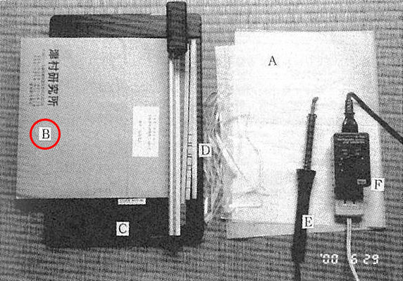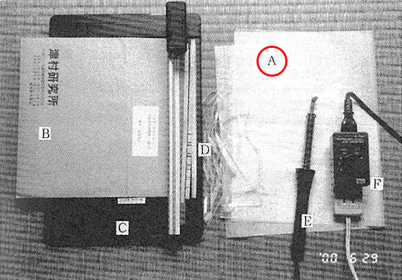 ヒートシールに使うハンダ鏝は前報のとおり、ラジオ用の先端(直径5mm)をいったん引き抜いて、平たく加工すればよい(Fig.1E).これはガスこんろとペンチと金槌があればできる。電流調節には、ハンダ鏝専用の小形コントローラーがある。私が購入したものは太洋電機産業製のパワーコントローラーPC-10(200W用)である(Fig.1F)。電灯用の調光器でもよい。これらはサイリスタ式のもので、最近は小形化したうえ安価になった。ラミントンで使われている接触抵抗式のコントローラーは、いつも同じつまみ位置を使うため、接触不良になって発熱することがある。サイリスク式にはその心配はないが、許容量より消費電力の大きい器具を使うと破壊される。またPC-10の場合には電源スイッチがついていないため、使用後はプラグから外しておかないと、常時電力を消費してしまうので注意せねばならない。電流調節はこういう出来合いのものがなければ、光量切り替えスイッチつきの電気スタンドを利用すればよい。