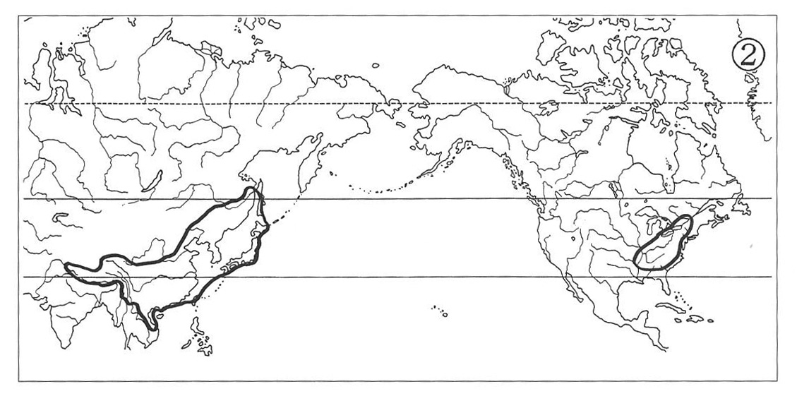Good examples of plants showing this pattern of distribution include the genera Panax (Map 1), Symplocarpus, Zizania, Hamamelis, Wisteria, Pachysandra, Caulophyllum and Phryma, which are seen in association with either temperate forests or in marshy habitats.