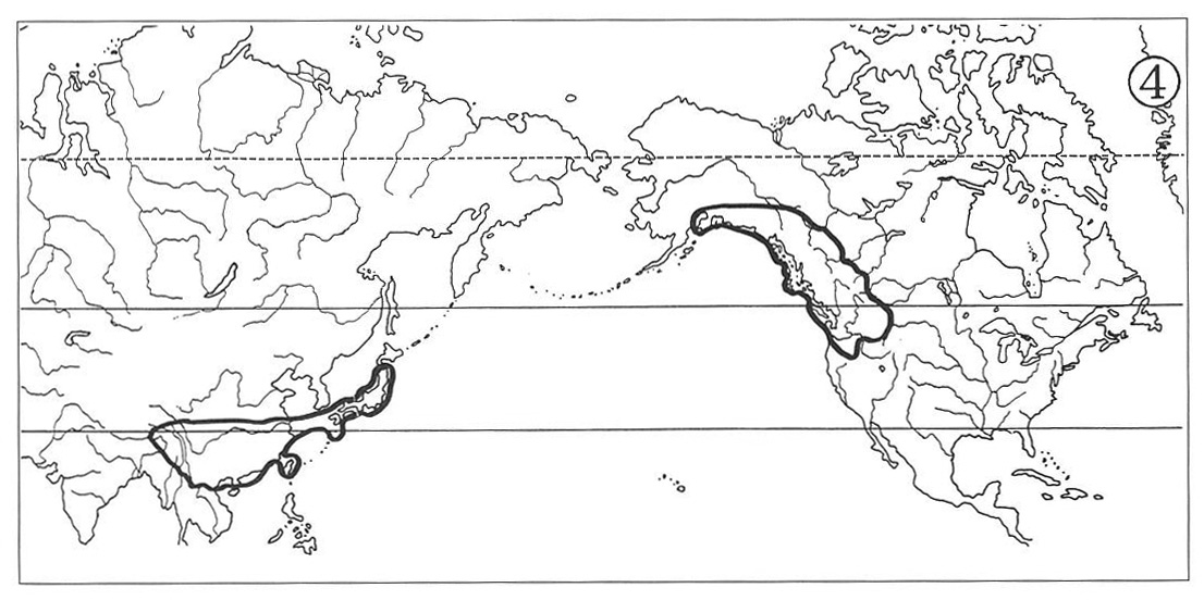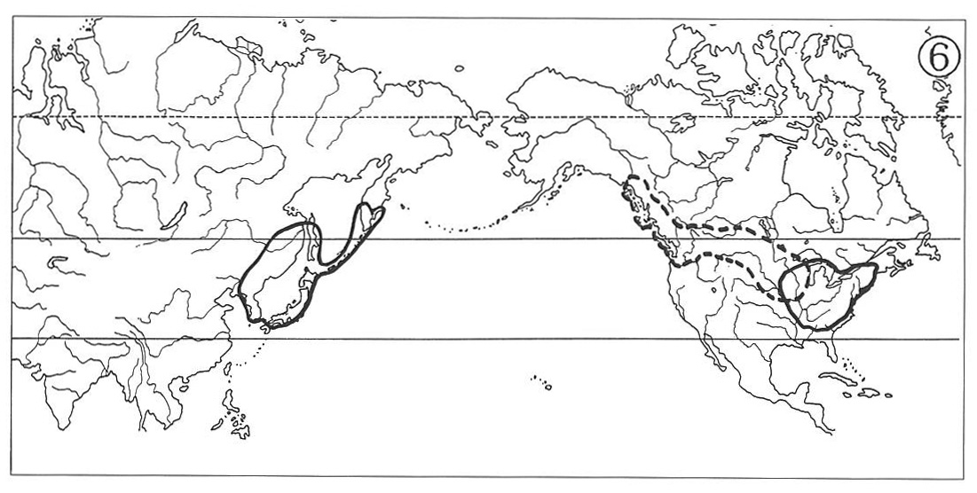 This type of distribution appears as a combination of the types (1) and (2) above, i.e., the North American ranges develop in both the eastern and the western parts of temperate North America, widely separated by the central and western portions of Mississippi River Basin and continued Rocky Mountains. The counterpart ranges in eastern Asia are similar to those of the two previous types. The genus Clintonia shows a typical example of this distributional pattern (Map 5). The distribution of Arabis lyrate (Map 6) may be attributed to this type. In this species, however, the ranges of its eastern American and western American subspecies meet in western Great Lakes Region, hence forming a continuous specific range simulant of the type (4) below.