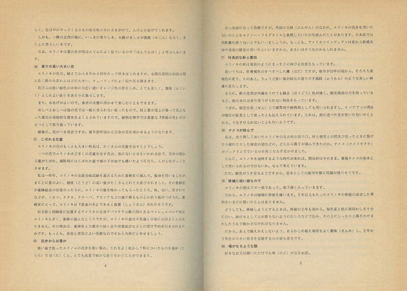 私は一昨年、ユリノキの虫媒効価試験を進めるために養蜂家に頼んで、蜜蜂を用いましたがまことに質のよい、糖度(とうど)の高い蜜がたくさんとれて大喜びされました。その養蜂家が養蜂組合の役員の人たちに、ユリノキの蜜を味わってもらったところ、味、匂い、舌ざわりなどが、ミカン、ナタネ、クローバ、アカシアなどの蜜に勝るものとの折り紙がつけられ、養蜂家にとって、ユリノキは『黄金の木』であると賞賛(しょうさん)されたそうです。