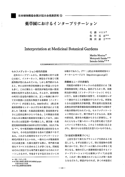 薬用植物園の役割が今まさに変わろうとしている。近年のハーブブームから、薬用植物に対する関心は高く、インターネット、雑誌などを通じて関連情報が巷にあふれている。しかし中には専門家からみると、何の科学的根拠もない間違ったものも多く、これに頼ると一般市民が毒性の強い薬用植物を乱用する恐れもある。そんな中、薬用植物の利用と安全性の確保には、正しい知識に基づいてその取扱い方法他を解説する指導者(インタープリター)が必要となってくる。特に実植物を公開する園においては、このブームに踊らされる事なく、常に正しい基礎情報を提示するインタープリテーション(*)たる媒体(メディア)が必須となる。