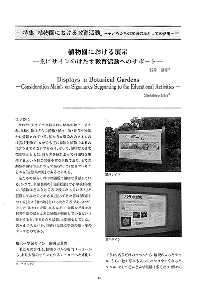 野外ミュージアムの中でサインは非常に重要なアイテムといえる。植物園はサイン以外にも様々な演出が考えられるが、植物と来園者を結び付ける直接的なアプローチにはサインが最も有効であろう。筆者は約25年間、植物園以外にもネイチャーサイン®に関わってきたが、その中で教育的な見地からプロデュースしたものをピックアップし、「子どもの見るサイン」について言及した。後半部では時代の流れにのった「CO2見える化ラベル」や「QRコード」を使った情報サービスも紹介している。
