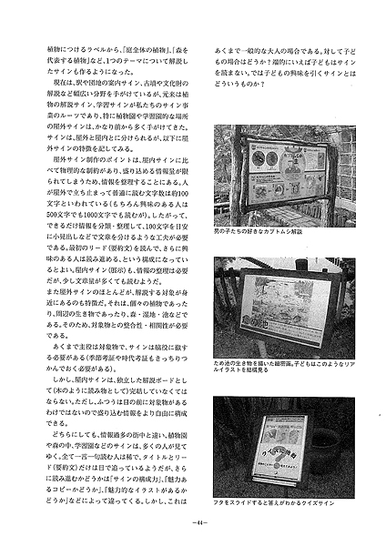 現在は、駅や団地の案内サイン、古墳や文化財の解説など幅広い分野を手がけているが、元来は植物の解説サイン、学習サインが私たちのサイン事業のルーツであり、特に植物園や学習園的な場所の屋外サインは、かなり前から多く手がけてきた。サインは、屋外と屋内とに分けられるが、以下に屋外サインの特徴を記してみる。