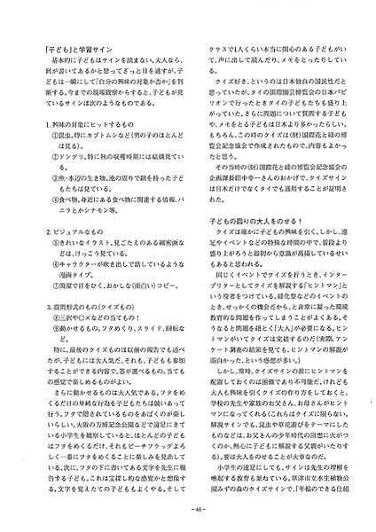 Among my 25-years experiences of a nature signature at various opportunities as well as a botanical garden. I pick up the items produced from the educational standpoint. And mention “the signature that the child watched”. The information service using “visualized label for CO2” and “QR cord”, which is carried on the passage of times. Is also introduced in the latter half.