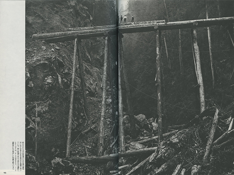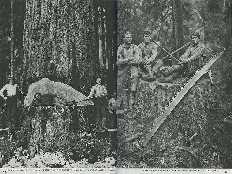 足場をつけ、オノを打ち込む。下にこぼれた木くずは荷馬車1台分にもなる。露出調整タイマーを使い、暗いところでは30分の露出で撮影することもあった- (Image 6: 写真解説)