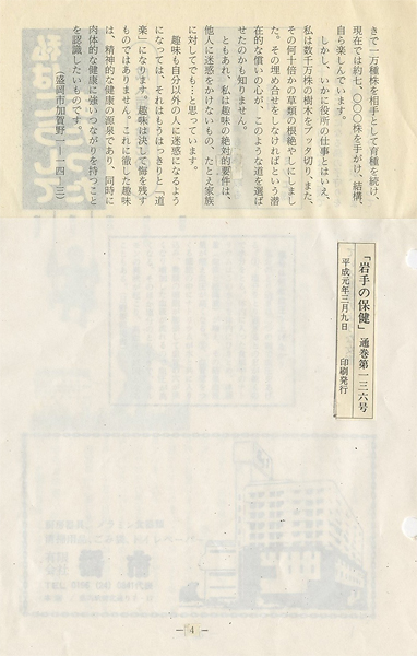 その後は宮城県立農業館(農業機械研究機関)い八年、宮崎県種蓄場と宮崎県畜産課に終戦までの十年、二十二年に里心がついたわけではなかったが、縁あって岩手県畜産課と農務課兼務で、畜力機械からトラクター時代を迎えるまで、その技術指導を担当しました。とくに三十四年以降は、農蚕課(農務課改称)で農業改良普及事業のなか農作業機械化推進を、畜産課では経営係として牧草の調査研究と草地造成の機械化部門を担当。林務部関係者からは「山林をねらい食いする泥棒猫だ」とか、「地球の皮はぎ屋だ」などと陰口をたたかれたものです。もっとも私がかかわった分だけでも一七、〇〇〇ヘクタールを越していましたから……。切り倒した雑木、掘りかえした林床の灌木や草花、とても数えきれるものではないほどでした。三十七年から久慈農林所長に出て三年後に定年退職で私の役所仕事は終りましたが、この最後の勤めは、その後の生涯を決めた貴重なものだったことは、後述する。ともあれ、この長い役所勤めの間にただ一度、たしか昭和二十五年の真夏、執務中突然に腹痛をおこし、七転八倒の苦しさ、県立盛岡病院にかつぎ込まれ八日間の入院、しかも腸チフスの疑いで隔離病棟の病床に移されたことです。