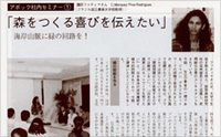 ファティマさんは、大学で生徒を教える傍ら、国営森林研究所の造林部長として活躍し、民間緑化企業のコンサルタントもされている。 今回、NGO基金の一環である、ジャパン ブラジルネットワークの招聘で来日されましたが、若くしてこのように多方面で活躍されている女性は、ブラジルでは珍しくないそうです。「環境問題はただ告発するだけでは解決しない」。「日本の実践家とのネットワークを育てたい」と、日本各地の研究機関を精力的訪問されており、今回、ご講演いただくことになりました。